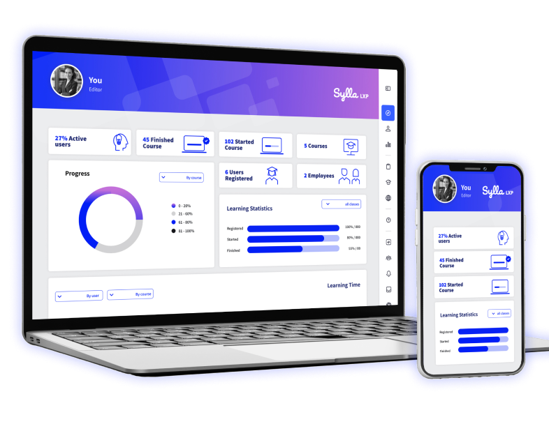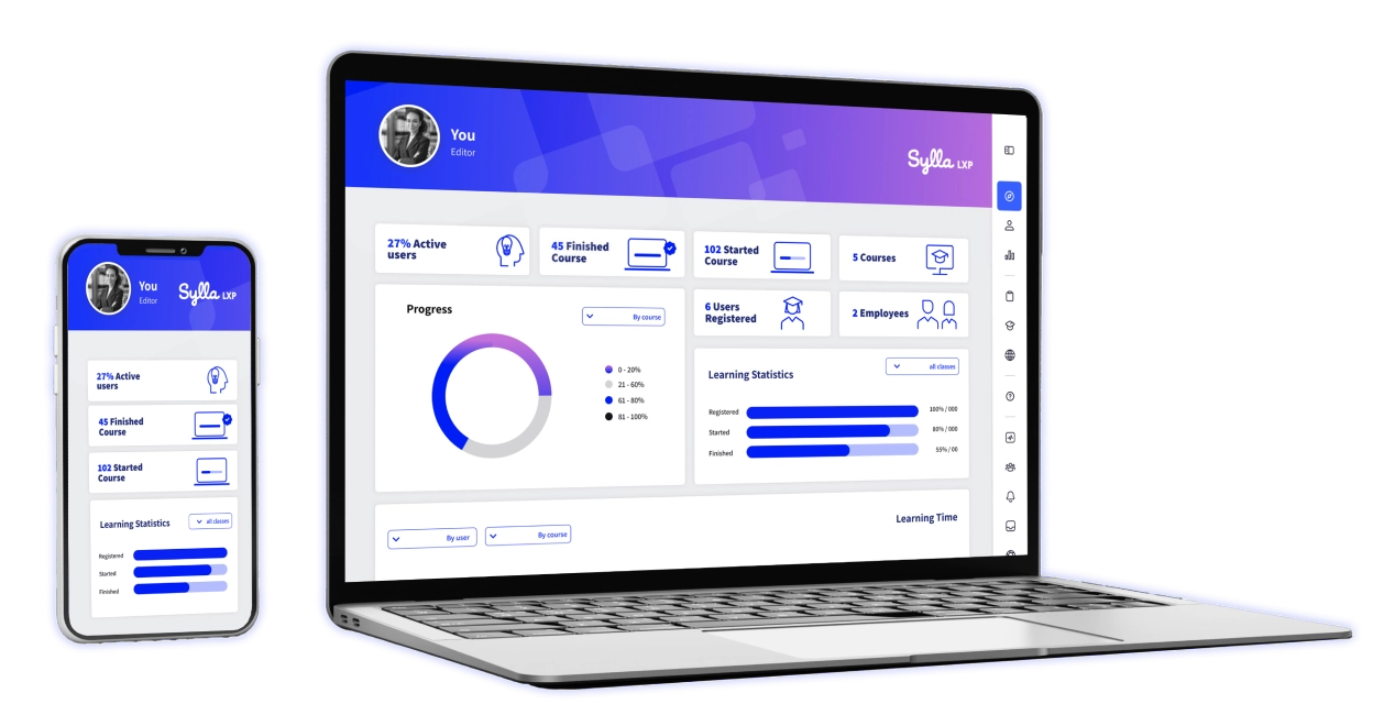מערכת ה- LMS של Sylla מפשטת את תהליכי הניהול, יצירת התוכן והנגשתו, ומעניקה לכם את היכולת לספק חווית למידה אינטראקטיבית שמעודדת מעורבות, שיתוף ידע והתפתחות אישית ומקצועית.